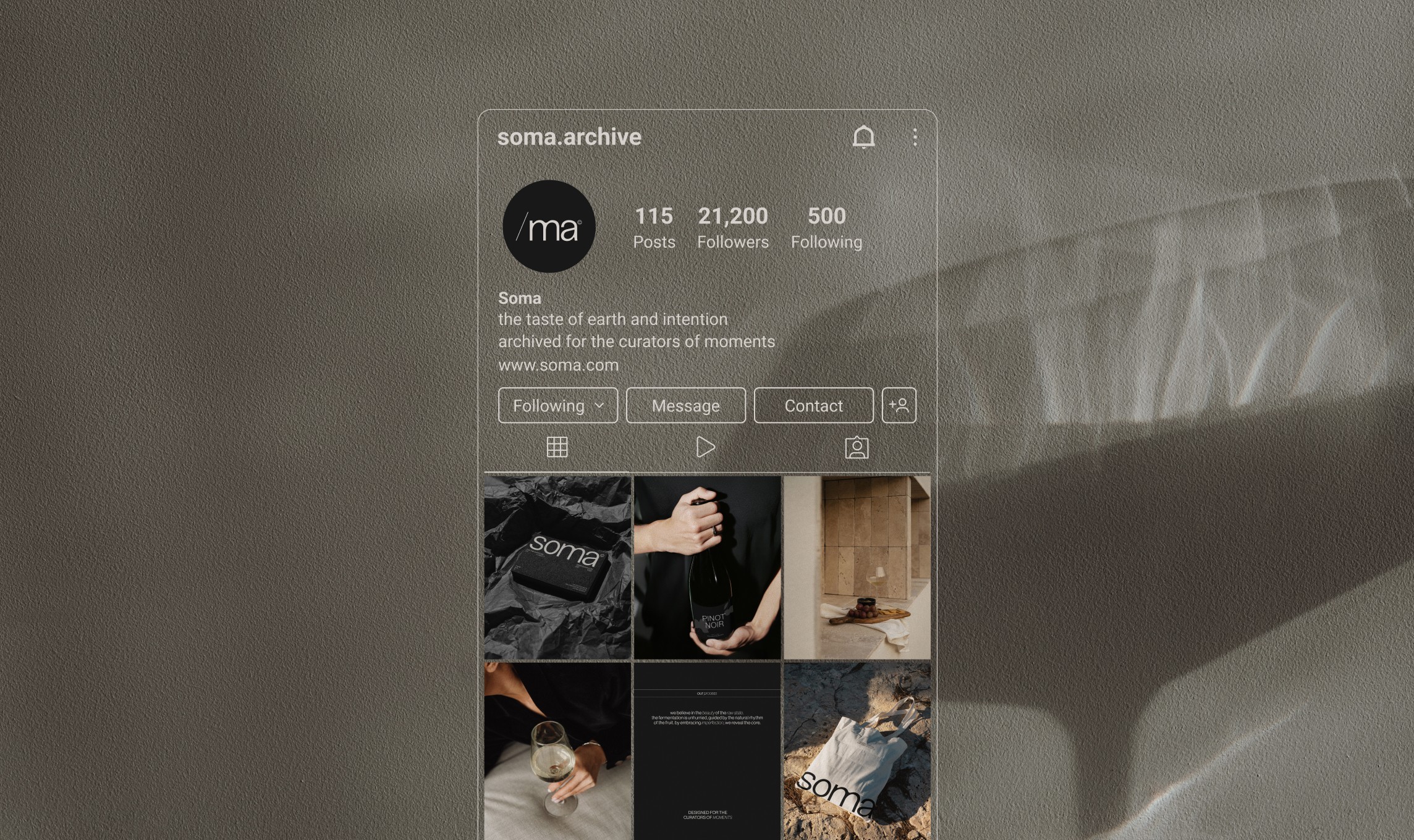 A conceptual wine brand exploring the tension between raw earth and architectural precision. No noise, just a visual anchor that tastes of cool stone and wild fruit. SOMA is for the few who notice the difference.
